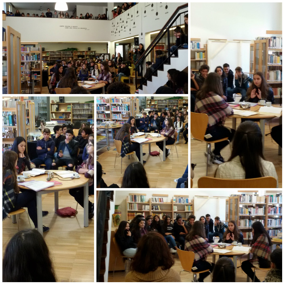 10h da manhã e a sala de leitura enchendo, enchendo, mezanino também, por todos os lados alunos, muitos, vários professores também. No centro uma mesa redonda e por lá um encontro de cientistas, mulheres cientistas: Marie Curie, Rita Levi-Montalcino e Mathilde Krim (duas delas prémio Nobel), representadas por três alunas do 9.º E (sob supervisão da prof.ª Orlanda, de Ciências).