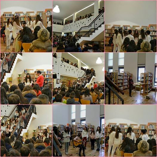 Manhã de sexta-feira, 13 de fevereiro, 11:45, sala de leitura e mezanino da biblioteca escolar da ES3 Alcaides de Faria a transbordar de alunos de várias turmas. O motivo? Celebrar o amor numa sessão de poesia, que também foi de música e dança. Os protagonistas? Vários alunos do Ensino Básico, que sob a supervisão dos professores de Inglês, Rui Campos e Olinda Martins, disseram poesia de Shakespeare (na língua original e em português), mas também de Eugénio de Andrade (As palavras interditas), cantaram, dançaram... e encantaram a mais de centena e meia de alunos e vários professores que constituíam a plateia. Que melhor véspera para o dia de S. Valentim!