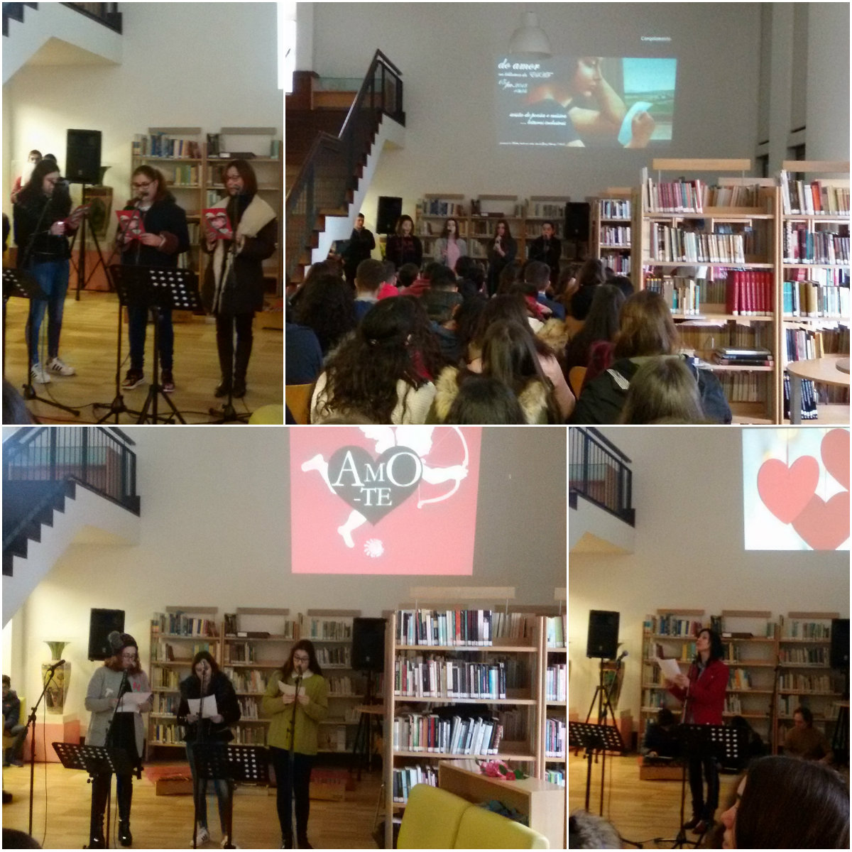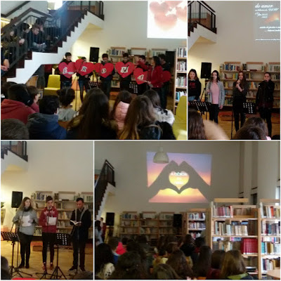 esta manhã, na sala de leitura da biblioteca da ESAF, poesia (as palavras dos poetas sobre o amor), cartas de amor (missivas de Fernando Pessoa a Ophélia), a ciência do amor (hormonas, feromonas e afins na bioquímica da atração), música, leituras... por alunos e professores, num momento de evocação do amor, da amizade, dos afectos... da riqueza literária que o amor convoca.