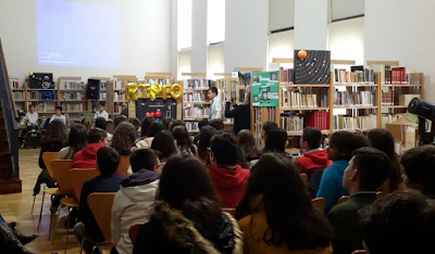Quinta-feira, 22/Nov., num ambiente de ciência com humor e muita, muita alegria, alunos da professora Madalena Pinto, encantaram e divertiram os muitos alunos e outros elementos da comunidade escolar, que encheram por completo os dois pisos da biblioteca da ESAF. Ao longo de mais de uma hora, a biblioteca foi palco de um interessante espetáculo, onde a diversão aliada à ciência marcou presença. Numa sucessão de breves mas cómicos apontamentos sobre cientistas e inventos, interpretados por alunos de diferentes anos de escolaridade; com lugar para a música e canções na onda, e com a dança de permeio, fez-se menção à ciência de forma lúdica e motivadora.
