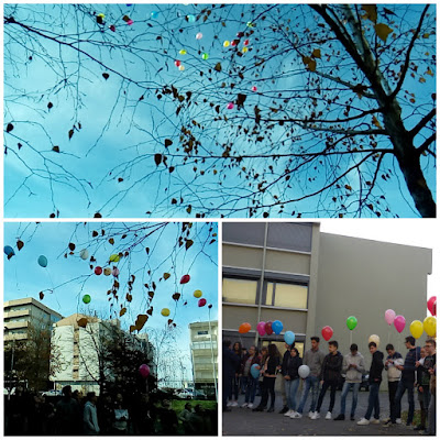 A sessão de sensibilização iniciou-se no espaço da biblioteca escolar, de onde partiram muitos alunos, com balões multicoloridos e com eles as inscrições de cada um dos artigos da D.U.D.H., e desenvolveu-se em espaço aberto, dentro do perímetro da escola. Ali, num dos nossos espaços verdes, falamos do que está em causa quando a causa são os direitos humanos, de como importa conhecer cada um dos direitos que nos assistem como cidadãos e de como, no mesmo repto, importa saber dos nossos deveres perante os outros, a sociedade.