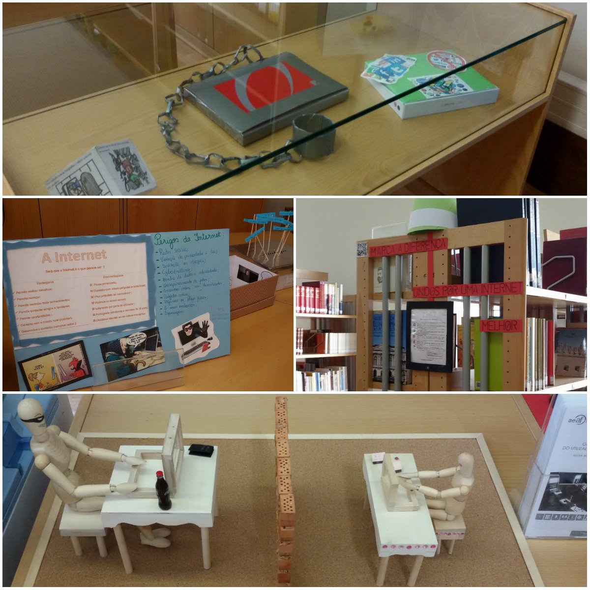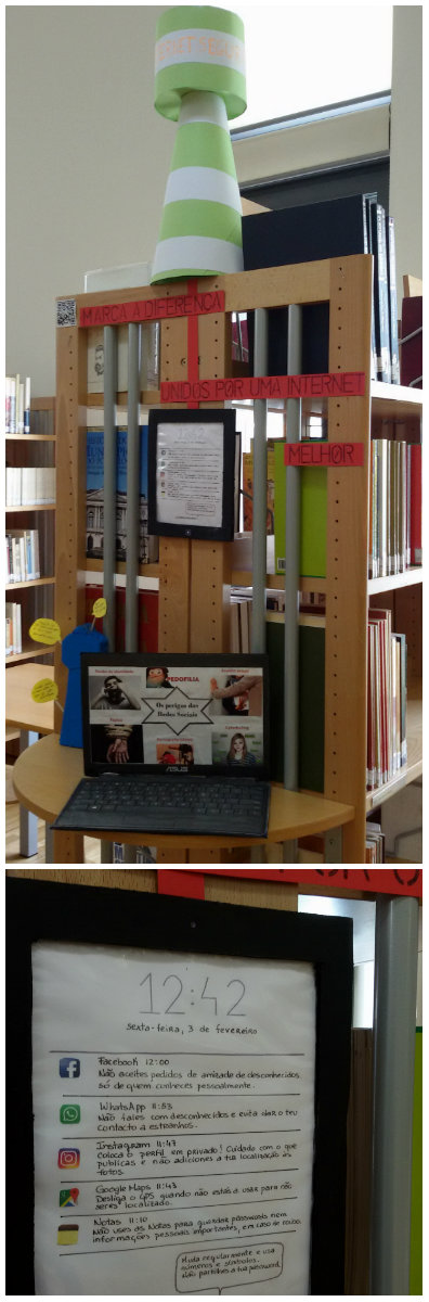É neste contexto que surgem vários trabalhos (realizados por alunos do 8.º ano, sob supervisão da professora Fátima Silva, colaboradora da biblioteca escolar da ESAF) que, por estes dias, se mostram no espaço da biblioteca e, de forma criativa, chamam a atenção dos alunos não apenas para os diferentes perigos associados ao uso incauto (e por vezes até irresponsável) da Internet, mas também e de forma positiva para atitudes e comportamentos a ter em conta no que toca à utilização desta imensa rede digital.