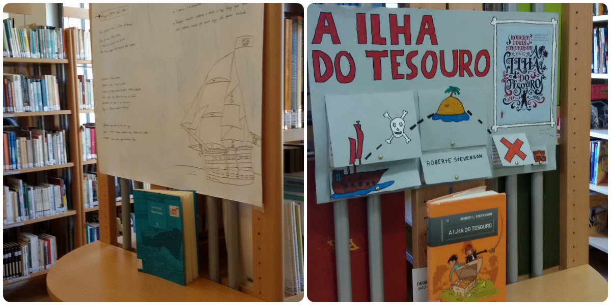 Se no mês passado coubera a Crónicas de Nárnia - o leão, a feiticeira e o guarda-roupa, de C. S. Lewis e a Trash, de Andy Mulligan, o lugar de destaque nas sugestões de leitura imaginativas propostas por alunos do 8.ºB, desta vez, são os livros: A Ilha de Tesouro (de Robert Louis Stevenson) e Doze Naus (de Manuel Alegre) aqueles que ocupam esse lugar, agora sob o olhar e a imaginação ilustrativa de outros alunos da mesma turma (sob supervisão da prof.ª de Português - Cristina Gomes). Viagens aventurosas, são agora o fio condutor, mesmo que na perspetiva de autores distantes no tempo e de diferentes literaturas e géneros, para que cada leitor/aluno, que pela biblioteca passa, atraída a sua atenção, possa descobrir, seja por via de um excerto, um breve comentário, um pormenor da ilustração... com que linhas se tecem as estórias e as viagens dos intervenientes nestas duas obras.
